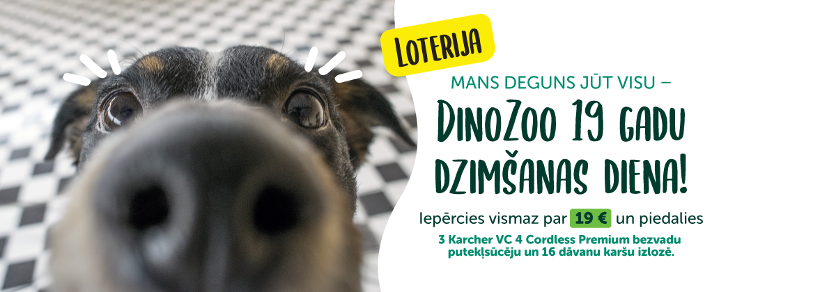 Līdz 30. aprīlim iepērcies veikalā Dino Zoo vai interneta veikalā www.dinozoo.lv vismaz 19€ (iesk. PVN) vērtībā, reģistrē pirkuma dokumentu un laimē Karcher bezvadu putekļsūcēju vai kādu no Dino Zoo dāvanu kartēm.