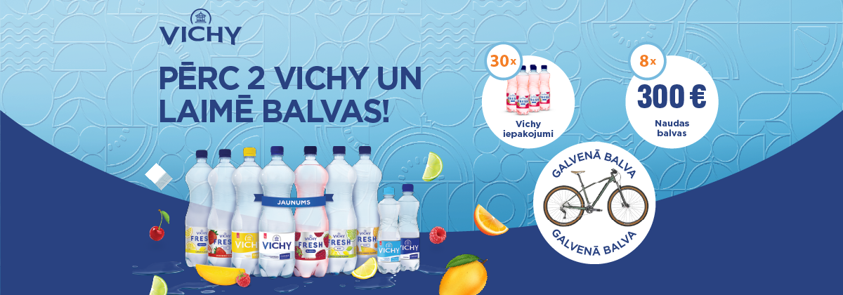 Līdz 30. jūnijam iegādājies vismaz divus VICHY produktus vienā pirkuma reizē, reģistrē pirkuma dokumentu un laimē velosipēdu Scott Aspect 930, naudas balvu 300€ vai kādu no Vichy ūdens iepakojumiem